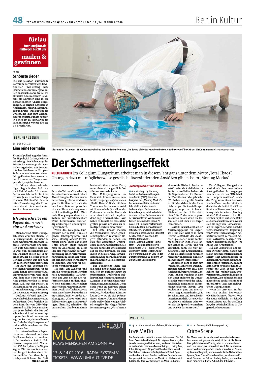 katakrasznahorkai March 15, 2016 Montag Modus in the TAZ…. “…kann ein Wimpernschlag einer Performance-Künstlerin einen Wirbelsturm in Budapest auslösen?” Total Chaos Schmetterlingseffekt_taz_130216plan Share this: Click to share on X (Opens in new window) X Click to share on Facebook (Opens in new window) Facebook Like Loading... Related